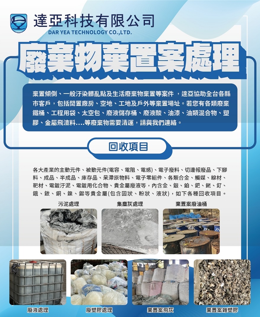 為專業甲級廢棄物清除機構,企業以永續、誠信、專業的態度經營廢棄物清除與貴金屬回收再利用。凡事業廢棄物含貴金屬具有回收價值者,如半導體工業印刷電路板業,電腦零組件工業,被動元件工業、電鍍行業。